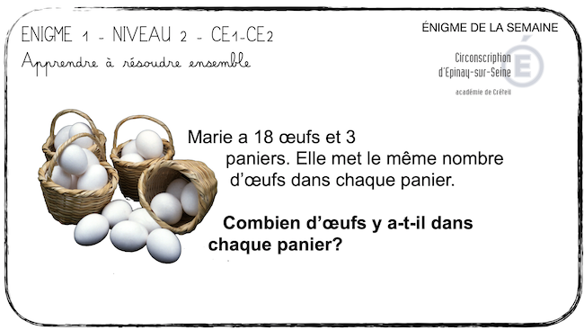 Marie a 18 œufs et 3 paniers. Elle met le même nombre d’œufs dans chaque panier.