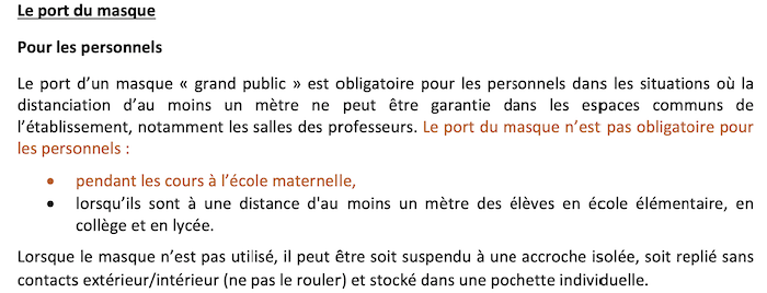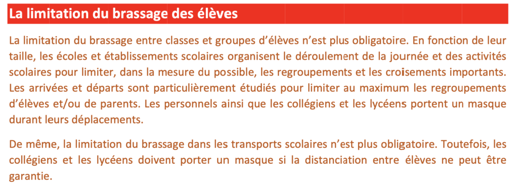 On lit également que, contrairement à ce nous avons pu mettre en oeuvre en mai et juin, les classes peuvent se mélanger allègrement. Cela risque de faciliter l’identification des contacts en cas de déclaration d’un foyer infectieux (cluster en français actuel).